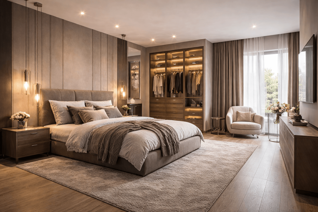 Мастер-спальня в доме и в городском жилье — несколько разные по масштабу решения. В загородном доме её нередко располагают на отдельном этаже, где площадь позволяет создать по-настоящему просторный комплекс помещений. В городских условиях ограничиваются компактной, но продуманной версией — со встроенной гардеробной и смежным санузлом. Даже в таком виде этот формат существенно повышает качество жизни владельцев. Важно, что при любом масштабе ключевой принцип остаётся неизменным: этот блок — изолированная, самодостаточная зона, не зависящая от остального жилья.