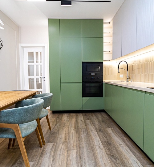 Зеленый и нежно-розовый — цвета, которые стали вдохновением для интерьера квартиры в современном стиле.